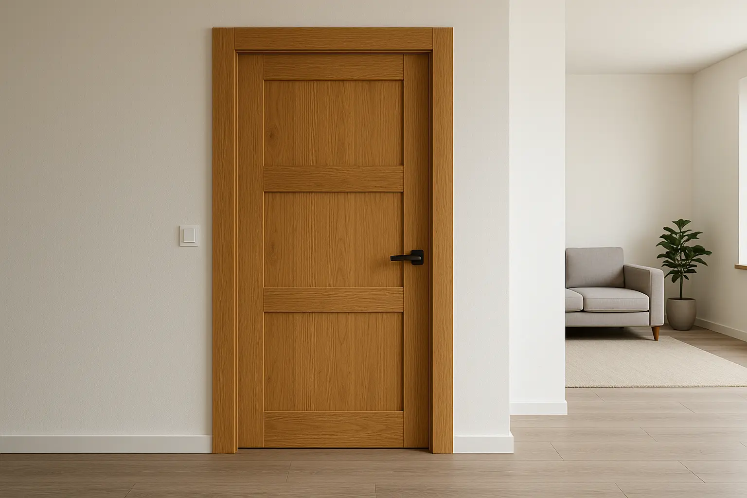 La porte massive désigne un modèle en bois véritable, composé d’un parement épais en essence noble (comme le chêne, le hêtre ou le frêne), appliqué sur une âme technique en aggloméré ou en MDF haute densité (panneau de fibres de bois compressées, à la fois dense, homogène et très stable). Ce type de porte marie la richesse visuelle du bois naturel et une structure pensée pour la stabilité et la durabilité.